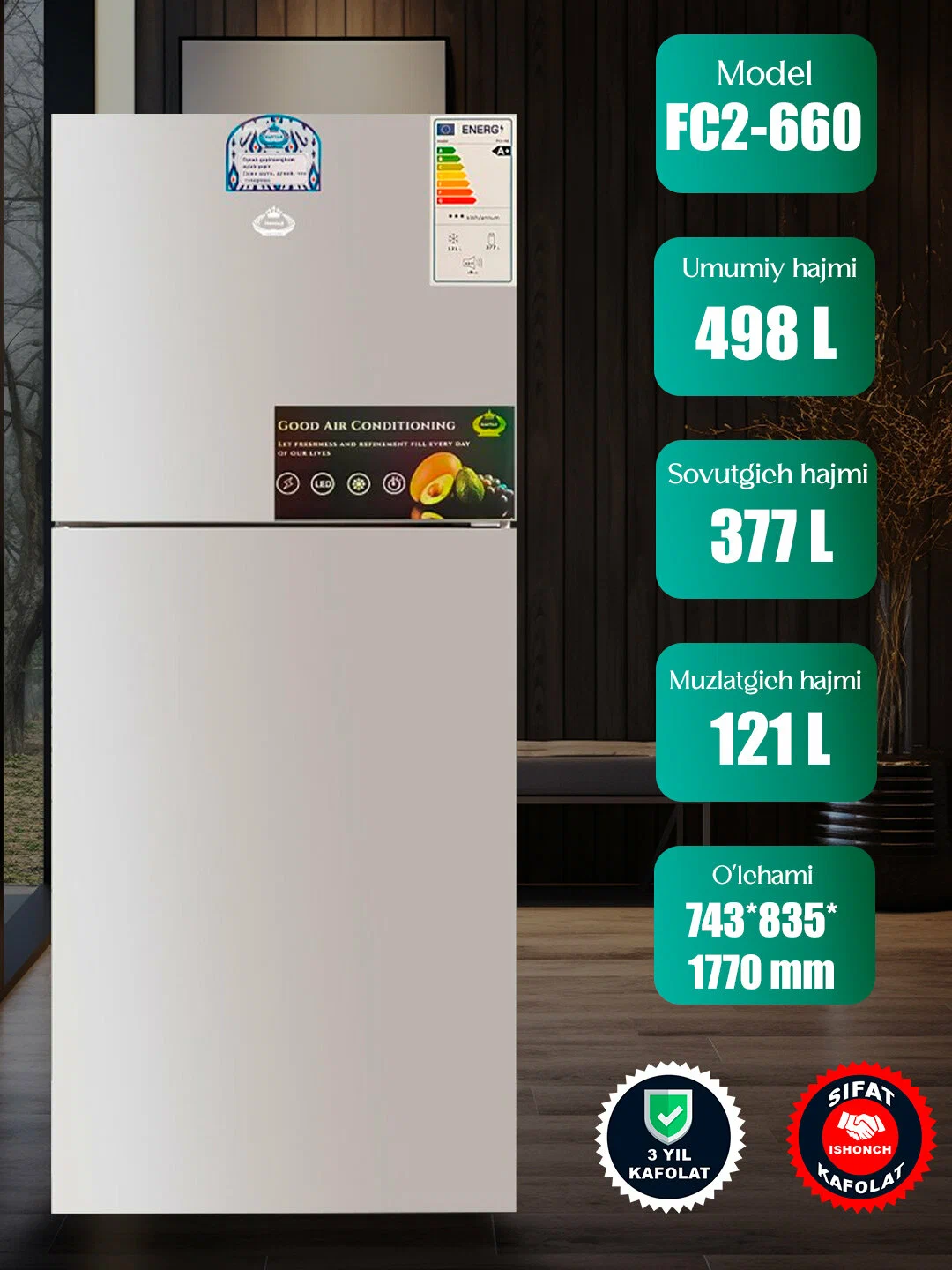 Холодильник HANTAJI FC2-660 Общий объем - 498 л Объем морозильной камеры - 121 л Объем холодильной камеры - 377 л Гарантирует сохранение первоначального вида продукта Размеры: 743*835*1770 мм Общие характеристики Бренд Savdo belgisi yoʻq Цвет товара бежевый Морозильная камера сверху Материал покрытия металл Тип управления электромеханическое Размораживание морозильной камеры No Frost Размораживание холодильной камеры No Frost Зона свежести да Тип зоны свежести сухая и влажная Объем зоны свежести 121 л Класс энергопотребления (по 2020) A+ Класс энергопотребления (с 2021) A Тип компрессора инверторный Количество компрессоров 1 Габариты и объем Высота 177 см Ширина 74 см Глубина 85 см Общий объем 498 л Объем холодильной камеры 377 л Объем морозильной камеры 121 л Производительность и режимы Режимы суперзаморозка, суперохлаждение Минимальная температура в морозильной камере -6 Оснащение Количество камер 2 Количество дверей 2 Материал полок стекло Дополнительные функции индикация температуры Климатический класс климатический класс N Индикация отключения электропитания звуковая Индикация открытой двери звуковая Индикация повышения температуры звуковая Особенности конструкции перевешиваемые двери Дополнительно Вес 50 кг Гарантийный срок 36 мес. Подходит для гостиниц да